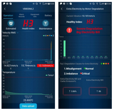 Tích hợp Machine Learning và các chỉ số sức khỏe giúp VB-800(ML) ước tính lượng điện năng lãng phí do hỏng hóc động cơ, đồng thời giúp xác định các nguyên nhân gây lãng phí điện năng như sai phối hợp và mất cân bằng. Nhờ đó, người dùng có thể đưa ra quyết định bảo trì đúng đắn và giảm thiểu lãng phí năng lượng.